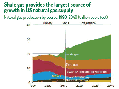 The impact both of ‘tight gas,’ also obtained from rocks – in this case non-sandstones – like shale gas by hydraulic fracturing, cannot be overstated. US total output gas will grow by about one half by 2040, says the US Energy Information Administration (EIA), even as conventional sources continue their now-decade-long decline (see chart, below).