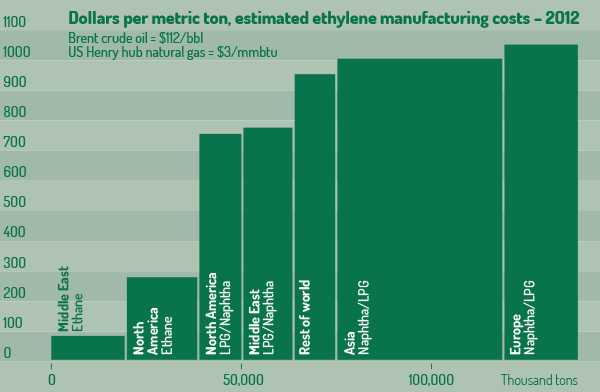 Shale gas production has soared in the US, with the country about to cross over from being a net importer to a net exporter of natural gas. Prices have not only decoupled from those of crude oil, they have plunged by as much as two-thirds from their peaks of 2007-2008. And because much of shale gas is famously ‘wet’ – rich in natural gas liquids – ethane, propane and butane are becoming massively available at bargain-basement prices.